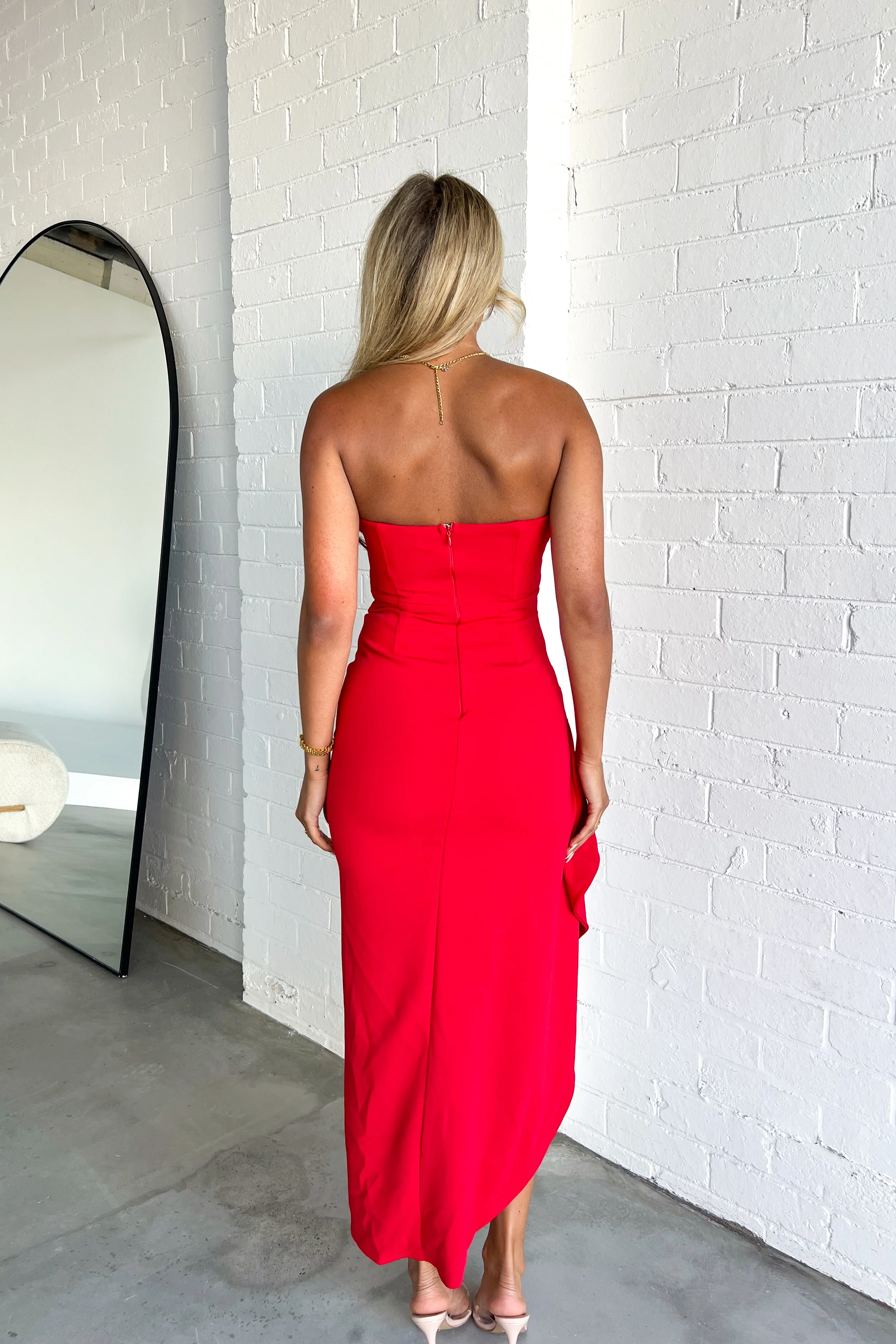 This stunning red strapless dress is a perfect blend of modern design and timeless elegance. The dress features a bandeau-style top with a ruched finish that adds texture and flattering detail to the bust area. The asymmetrical slit on the side provides a bold and sophisticated flair, making it perfect for special occasions or evening events.