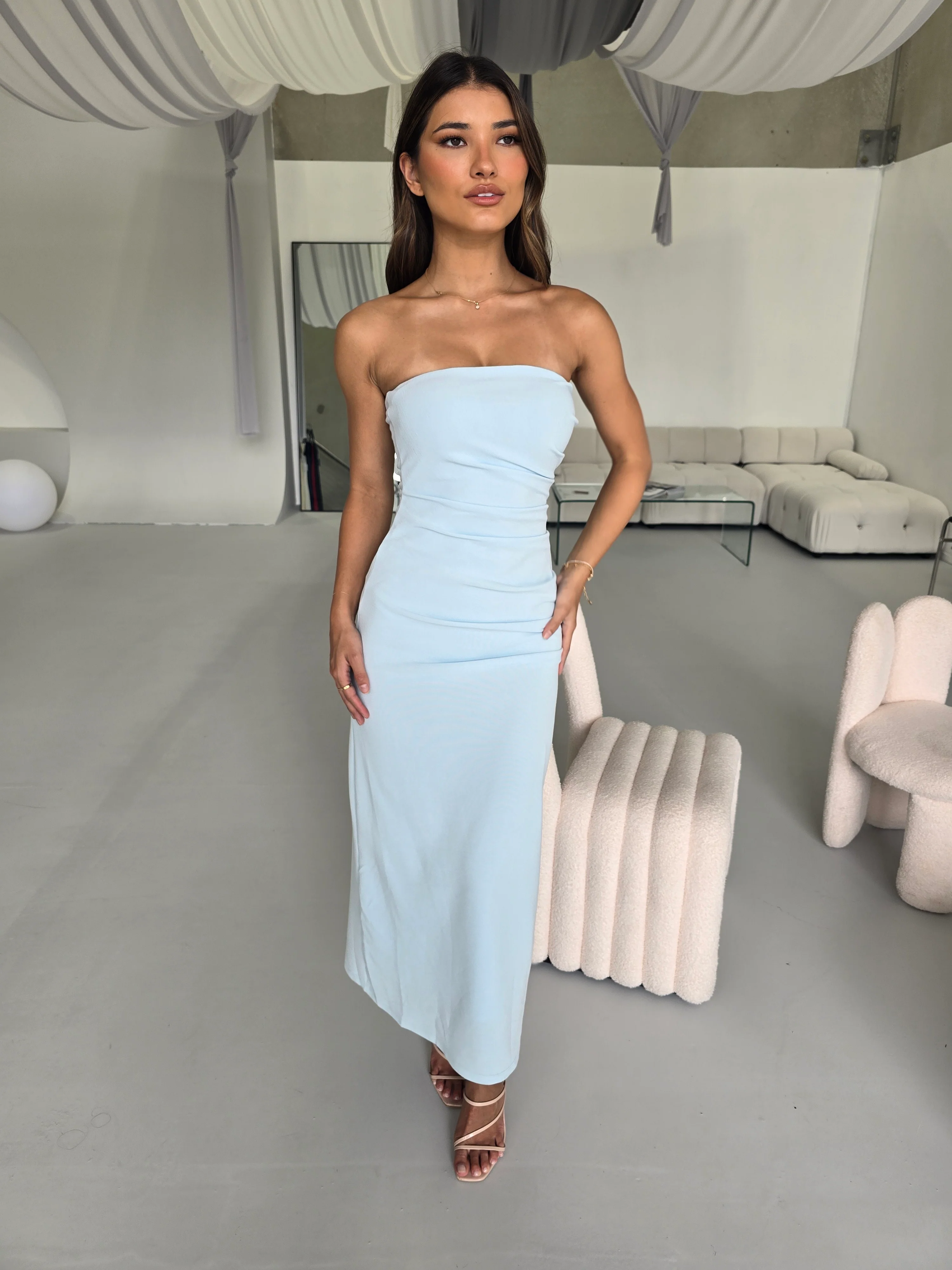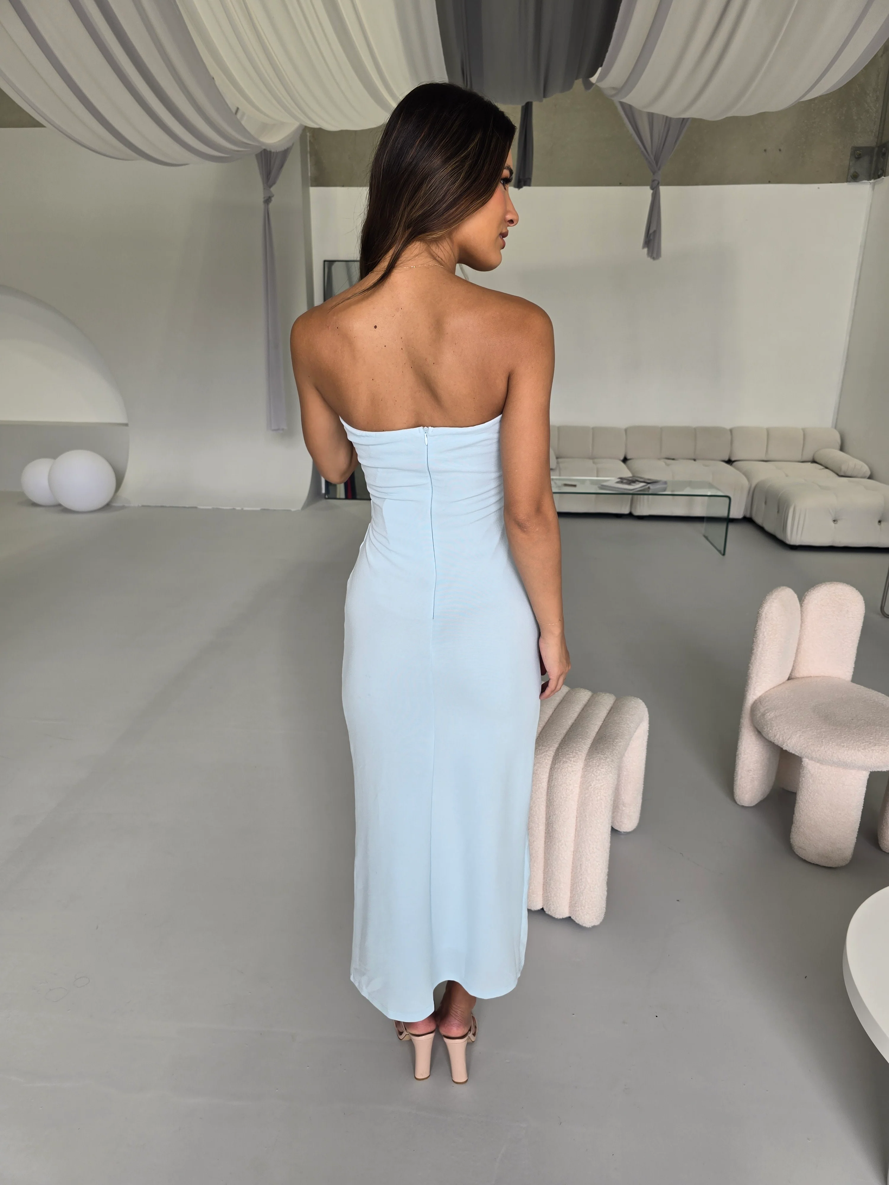 The serene light blue hue of this dress is perfect for various occasions, from casual outings to sophisticated evening events. The strapless design highlights the shoulders, adding a touch of elegance and sophistication. The fabric drapes beautifully and is soft to the touch, making it an essential piece for anyone aiming to exude effortless charm and grace.