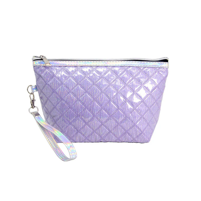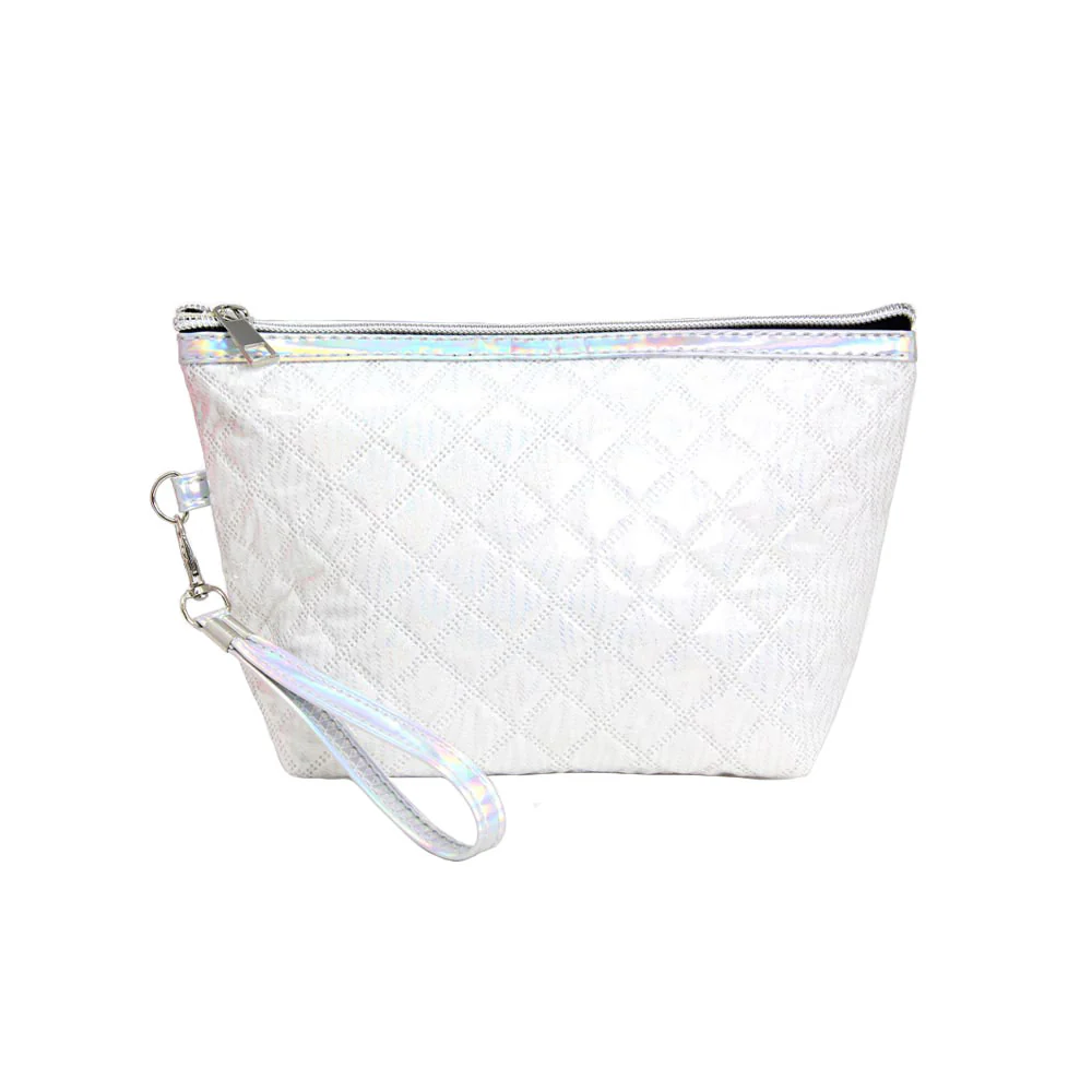 The bag features a convenient wrist strap, allowing for easy carrying and hands-free convenience. The iridescent silver trim and zipper provide a lovely contrast to the black body, creating a chic and modern look.