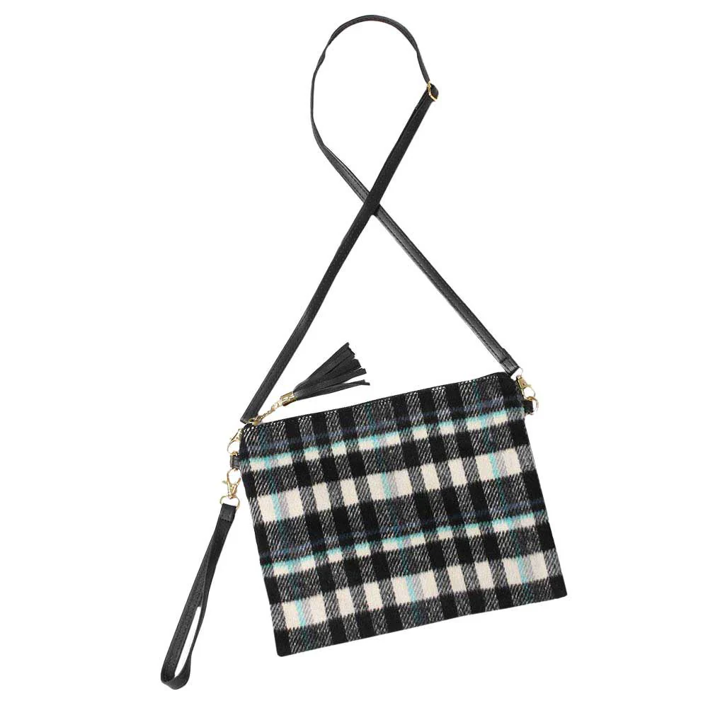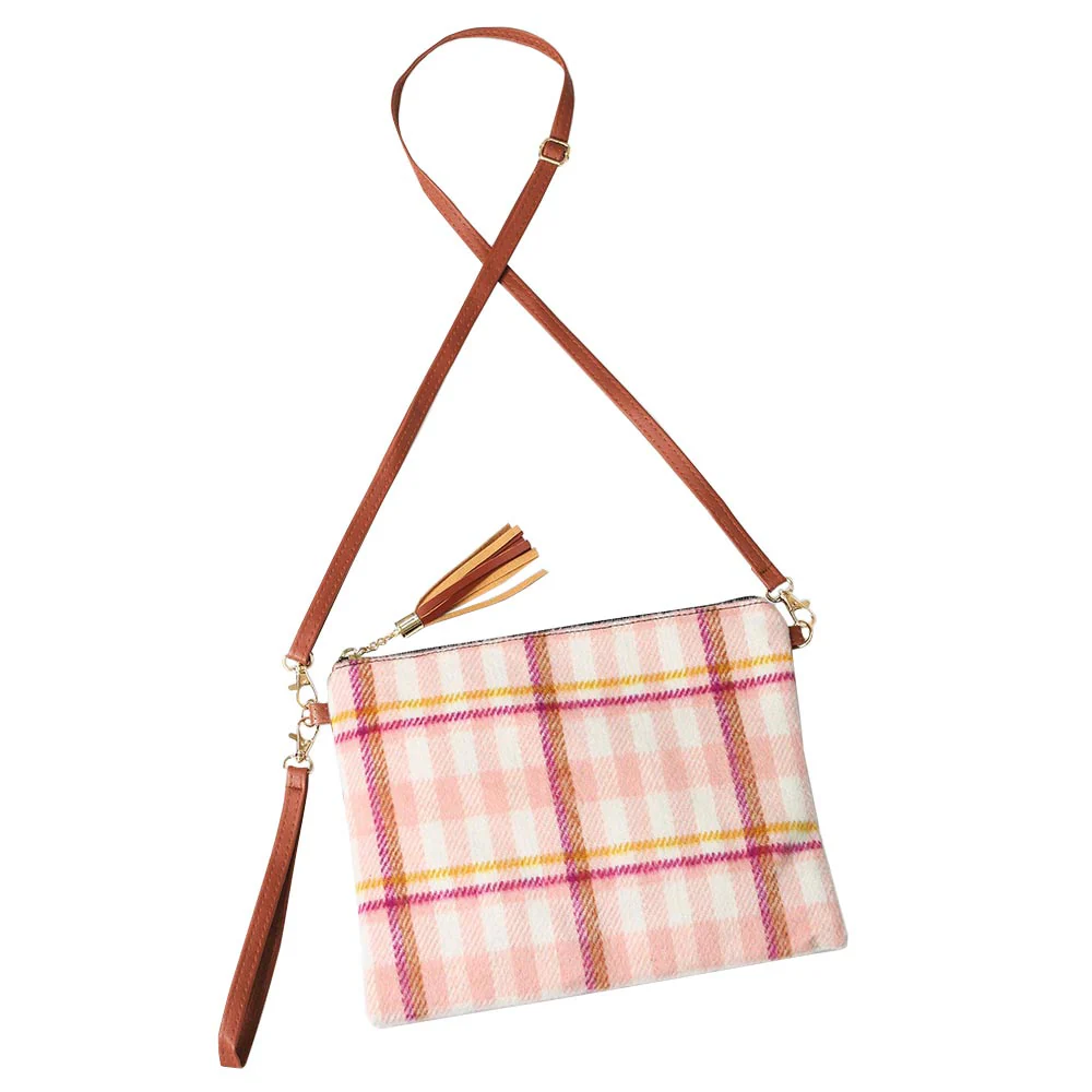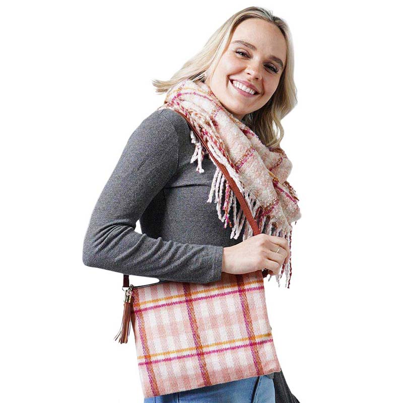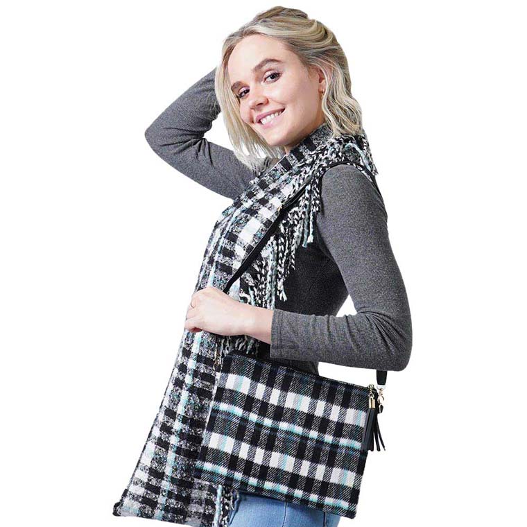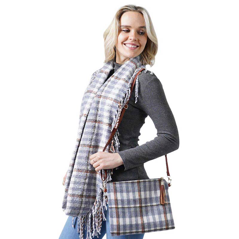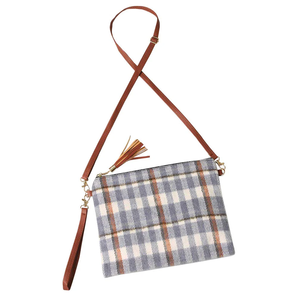 This chic crossbody bag is designed to add a touch of elegance and practicality to your everyday style. Its stunning plaid pattern with a blend of earthy brown and calming blue hues creates a perfect accessory for both casual outings and formal gatherings.