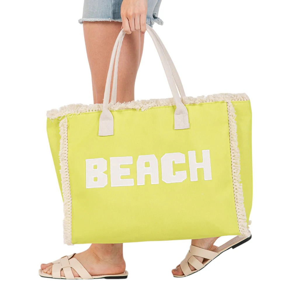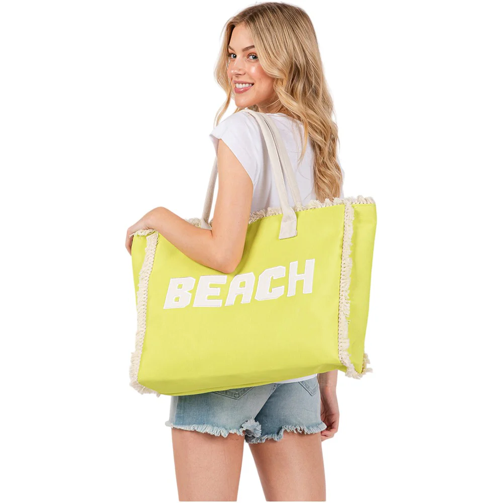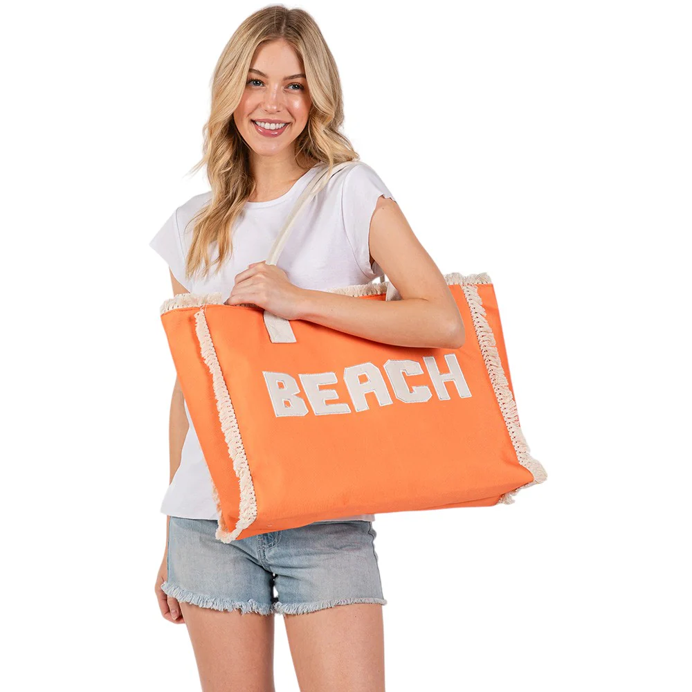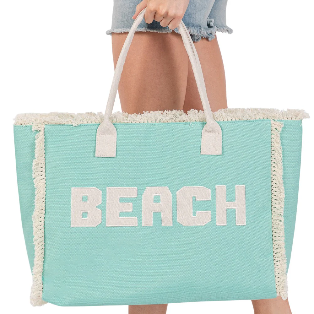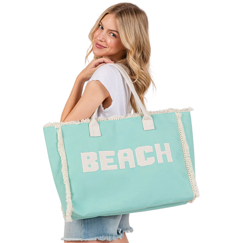 This roomy and stylish beach tote is your perfect companion for sunny days by the sea. Made from durable yet lightweight canvas material, this bag offers both functionality and style for your beach outings. The bright blue color is complemented by the bold "BEACH" lettering, giving it a fun and summery vibe.
