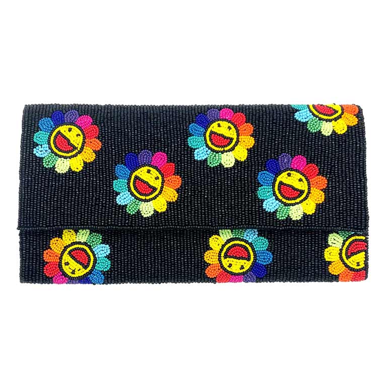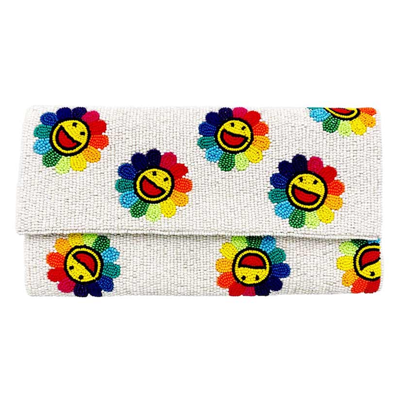 This clutch bag, adorned with cheerful smiley floral patterns, is a vibrant accessory perfect for adding a splash of color and joy to your ensemble. The fabric exterior exudes a sense of playfulness and whimsy, making it an ideal choice for casual outings or lively events.