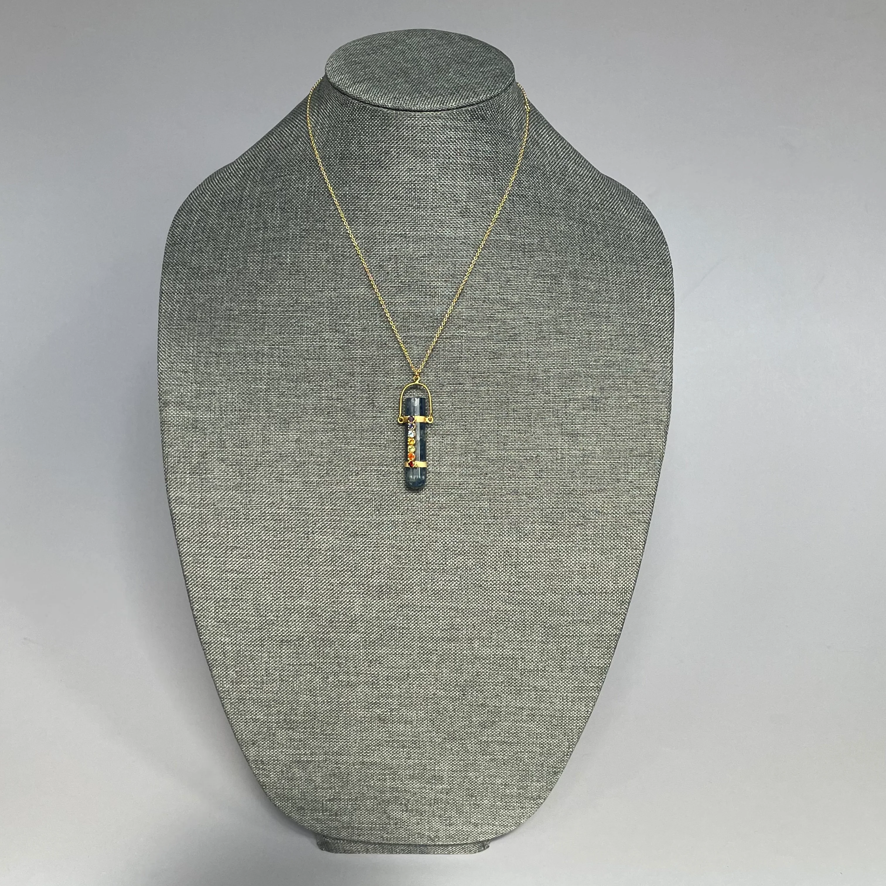 This exquisite necklace beautifully combines artistry and affordability, featuring a captivating cylindrical pendant. The pendant is adorned with a selection of colorful faux gemstones, each set with precision to add a touch of brilliance and elegance.