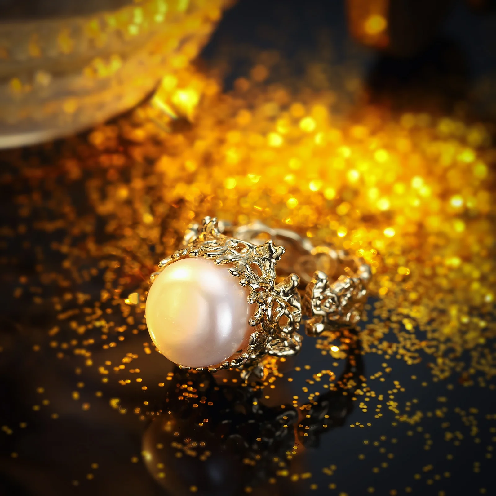 This exquisite ring combines timeless elegance with a touch of modern artistry. At its core, the design features a luminous faux pearl centerpiece, perfectly positioned to catch the light and captivate attention. Surrounding the pearl is a bold, intricately textured band crafted from high-quality zinc alloy with a durable gold-tone finish, offering a luxurious appearance while maintaining affordability.