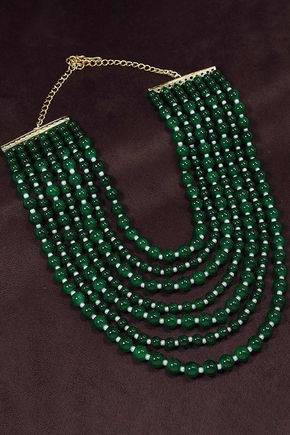 The necklace boasts multiple strands of vibrant green beads that elegantly drape around the neck, making it an ideal choice for both formal occasions and casual outings. Its lightweight nature ensures comfort while maintaining its stunning visual impact.